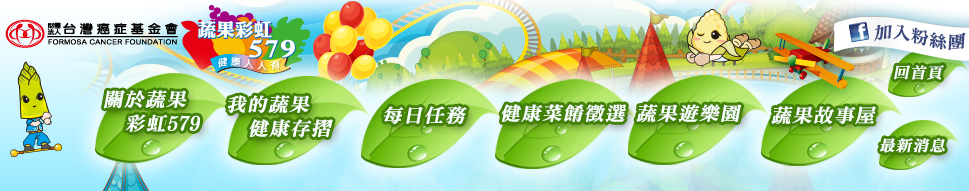回首頁 加入粉絲團 關於蔬菜彩虹579 我的蔬果健康存摺 每日任務 健康菜餚徵選 蔬果遊樂園 蔬果故事屋 回首頁 最新消息